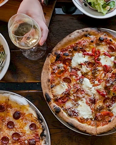 Each pizza is baked in a custom 700-degree wood-fired oven fueled by kiln-dried oak, infusing a bright, smoky flavor into every bite. Beyond pizzas, the menu features house-made antipasto, signature meatballs, locally sourced pastas, and indulgent desserts. Gluten-free crusts and vegan cheese are available, ensuring everyone finds a favorite.