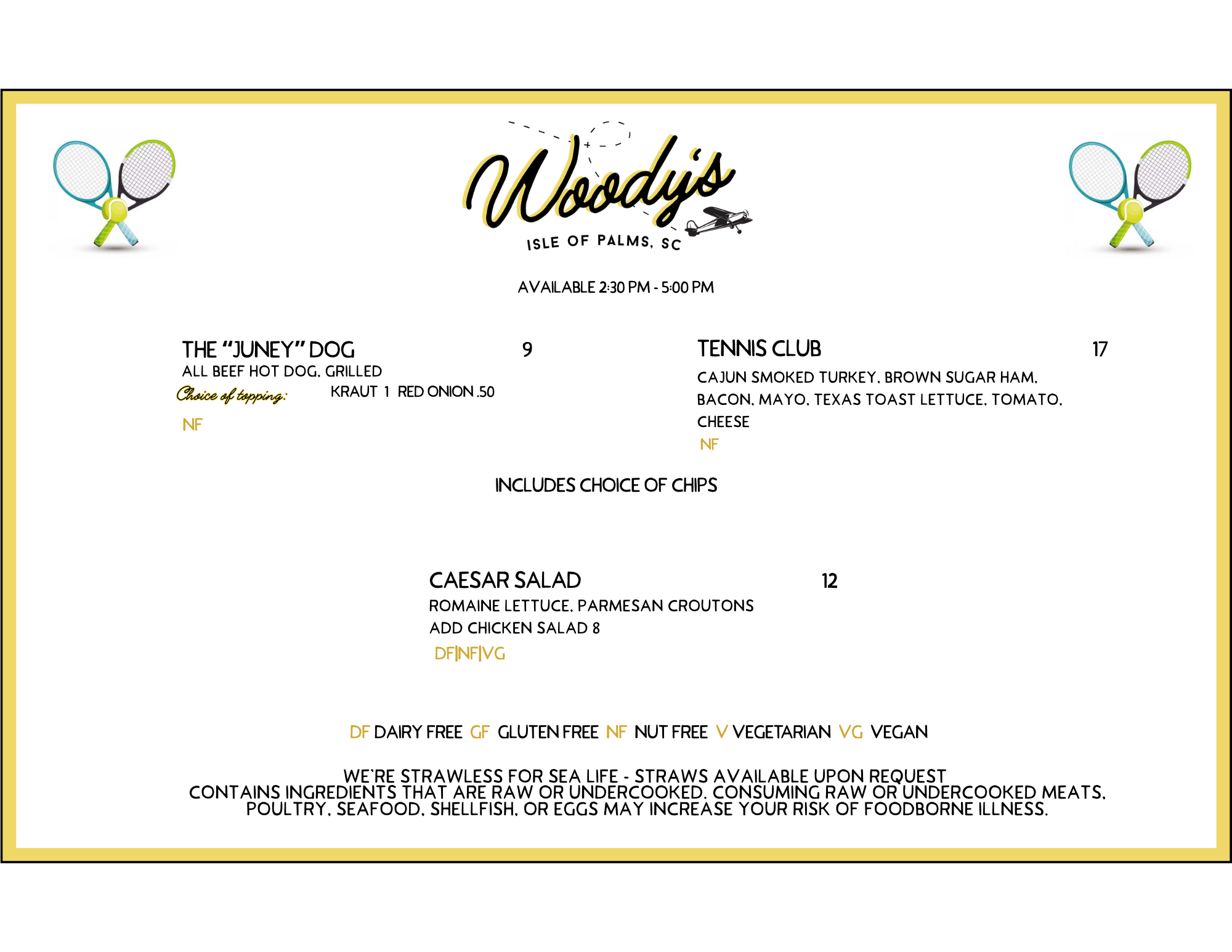 Serving breakfast classics all day, along with hearty hot and cold sandwiches, crisp salads, wraps, and Woody’s signature burger, this easygoing eatery satisfies every craving from morning to afternoon. A selection of beer, wine, and cocktails adds to the laid-back atmosphere — perfect before or after the courts, the course, or the pool.