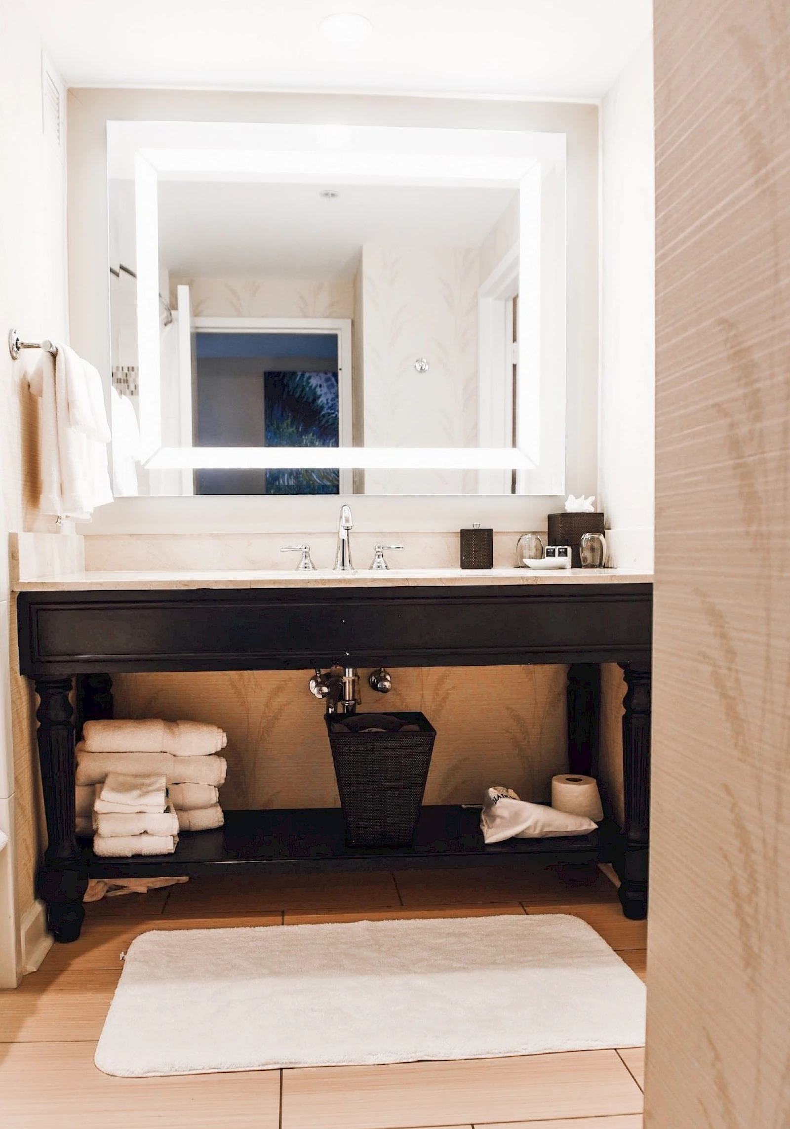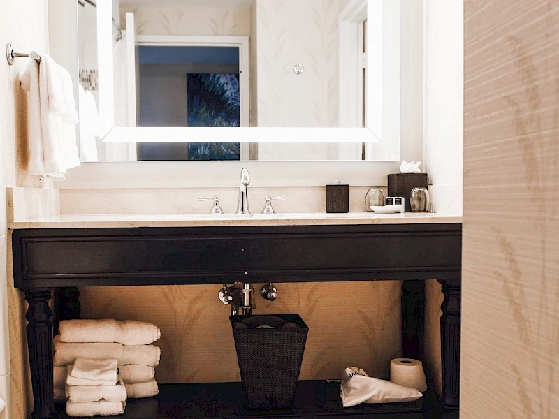Settle into this spacious room with one king bed, queen size sleeper sofa and dedicated work space. Enjoy a view of the adults only pool and Grand Pavilion boardwalk. Light beachy hues, coastal décor, and a spa-inspired bathroom contrasted by dark woods and modern fixtures provide an upscale coastal vibe.
