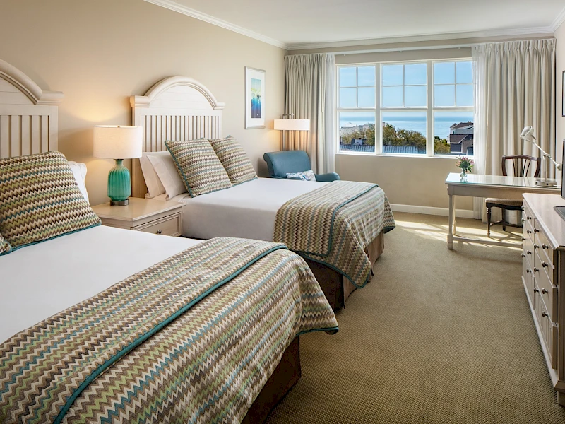 A spacious retreat with classic coastal décor, featuring a king bedroom, a second bedroom with two queens, two bathrooms, a full kitchen with drip coffee maker, in-unit washer and dryer, dining and living space, and private balcony—ideal for families.